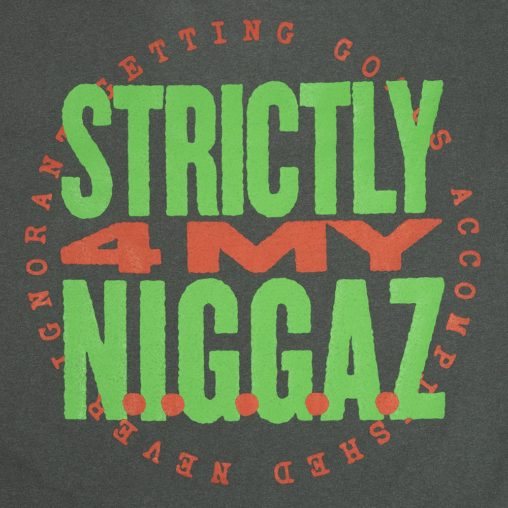 Black short sleeve t-shirt featuring 2PAC fist logo printed on front and “Strictly 4 My N.I.G.G.A.Z.” printed on the back.